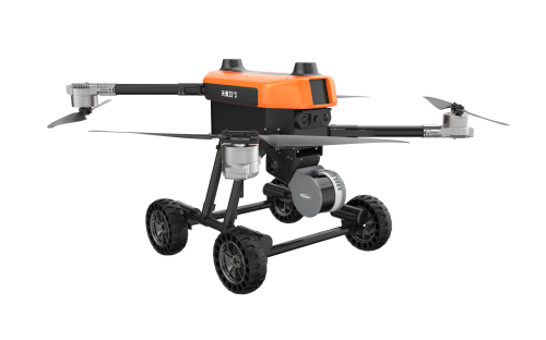 本无人机为北京凌天智能装备集团研发的陆空两栖三维侦测建模无人机,采用四旋翼机身设计,载重大,续航长,并且机体折叠标准化负载接口。同时,该无人机具备陆空两栖功能,可以在地面行驶。