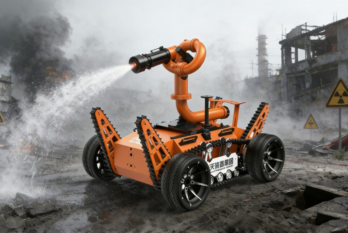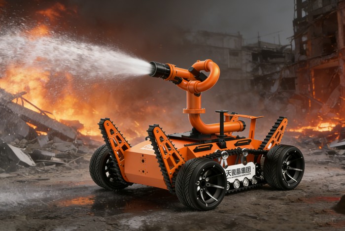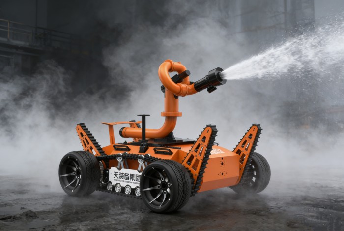 机器人采用无线遥控设计,遥控器与监视器一体/分离,可实时的显示电池、内部的各种信息,机器人状态、现场温湿度、有毒有害气体浓度报警信息等控制机器人前进、后退、转向等运动。具备远程侦察能力,机身搭建升降云台、高清摄像头、热成像摄像头、气体传感器三类环境感知设备和云台控制设备,也可联动声光报警模块提醒消防人员或群众,有效避免危险。在通过远程侦察手段有效获取现场火源信息后,机器人配备的大功率电机可以帮助消防人员将消防水袋拖拽至危险火源区域进行灭火,并能搭载各类国内、外的多种消防水泡,并能够远程控制发射水或泡沫。基于所配备的拾音模块和扬声器模块,拾取现场环境声音,即使消防官兵未靠近消防现场也能够听到搜救现场的群众呼救声,并通过扬声器模块与群众进行现场对话。