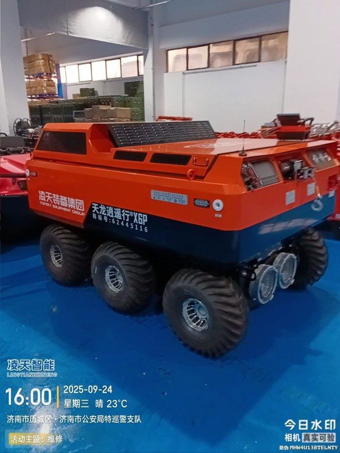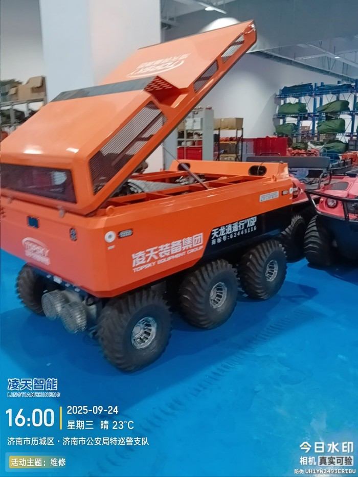 采用6×6轮式底盘,液压驱动,装有真空轮胎,另加配水下推进器,增加水中行进效率,水陆两栖,可全地形行驶;