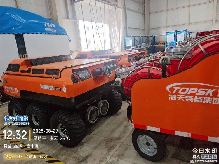 供排水机器人配有大口径水带收放车,采用电动快速铺设系统,操作简单,实用性强等特点,解决了人力收放水带的不便利性,增加了救援时间。