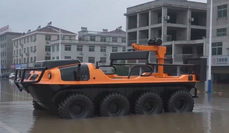 针对水灾频发的地区,水域救援任务必不可少。但往往洪涝灾害、城市内涝往往伴随着恶劣的天气和崎岖的地形,冲锋舟需要多次搭载不同交通工具并数次转移,全地形多功能水陆两栖运输车可以轻松通过水淹、泥泞、沼泽等环境,无需人力搬运,实现陆地驾驶和水中行走自由切换,以最快的时效抵达现场实施救援。