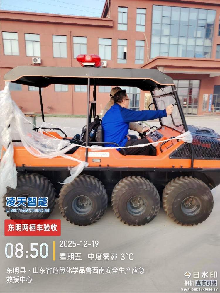 以完成可靠的野外应急救援为目的,该水陆两栖全地形车可提供一种安全的运输方式和可靠的运载平台,产品可以在山地环境、湿地环境、沼泽环境、水面环境、丛林环境等多种工作环境下,实现全天候连续作业。并且可以在灾害现场巡逻勘察、运送受伤人员、并有效实施援救。