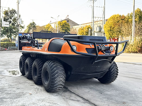 车体采用高分子复合材料真空一次成型,底盘采用高强度汽车大梁钢材焊接而成,全密封设计适配全场景受力需求,同时确保车辆在水陆环境中均能保持稳定。