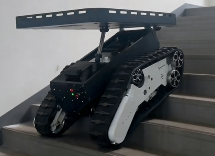 其以 “强适应性 + 高智能” 为核心优势:底盘采用橡胶横纹履带与先进避震系统,搭配轻量化一体压铸铝轮及耐用材质,可实现常规爬坡、极限爬坡,适配多地形穿行,保障复杂环境稳定运行。