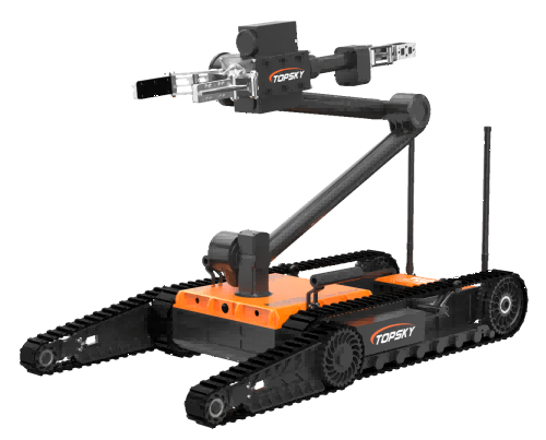 排爆机器人主要是用来处理爆炸物相关工作的排爆式机器人,也可用于侦察人难以达到的地形的一种机器人。7自由度排爆机械手能实现不同角度旋转,近端最大可抓举16KG的重物,小手爪可抓取3KG重物,机械臂可装载爆炸物销毁器,可现场摧毁爆炸物,底盘采用履带+单摆臂结构,能适应各种地形快速作战部署。同时机器人配备有线控制可以网络干扰情况下通过有线远距离作业。排爆机器人可与配件一同使用,包括销毁器(例如29mm),爆炸物的远程引爆控制系统等。
